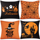 Orange and Black Happy Halloween Linen Throw Pillow Covers Set